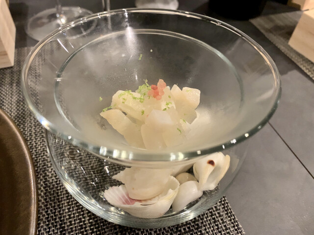 焼き茄子、とり貝、雲丹、海鮮ジュレ