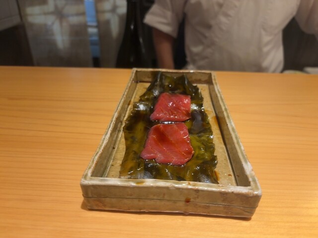 ◉ 鮪赤身漬け握り(昆布板醤油の上で寝かした)