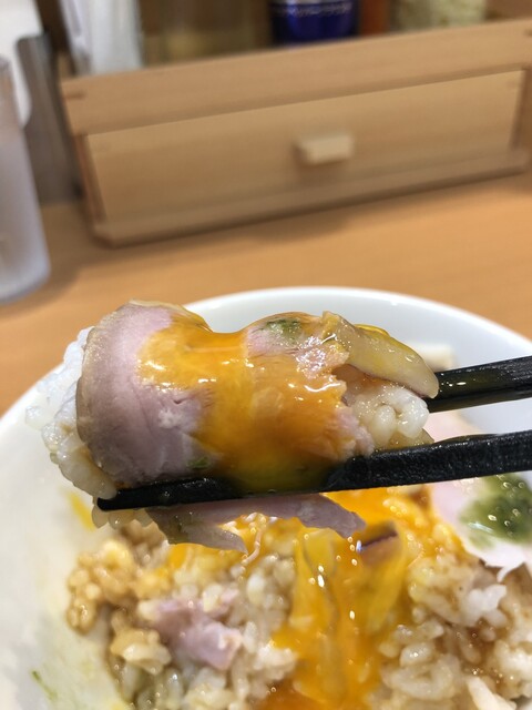 香り高いゆずをのせた塩スープ、スルスル入るストレート細麺…、何よりローストポークにバジルソースと濃厚な卵黄を絡ませて食べる「ローストポーク丼セット」は、ねっとりした味わいが最高でしたっ(良)!!