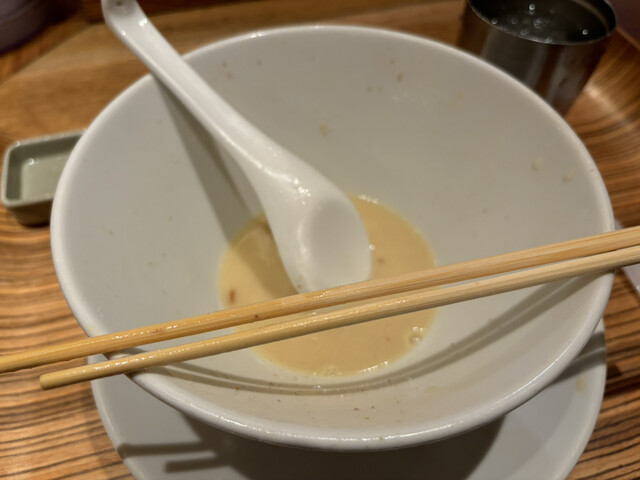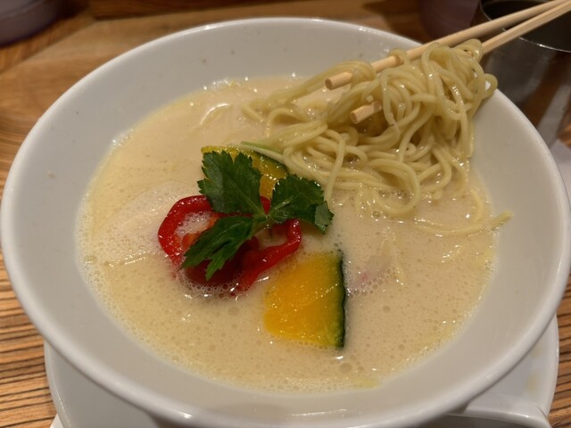 まず一口スープを飲むと予想通りのクリーミーな感じ、ポタージュスープの舌触りをサラッとした感じ。あっさりの中にコクがある。美味しい。塩味も丁度良く角が取れた感じ。麺は中太よりやや細いストレートでサクッとした感じ。トッピングの赤パプリカ、カボチャ、ダイコン、たけのこ、鶏焼豚が良い仕事をしている。味変の生姜がまた良くお気に入り。次は鶏白湯(醤油)や蛤と牡蠣も頂きたくなりリピートしたいお店です。ご馳走様でした。