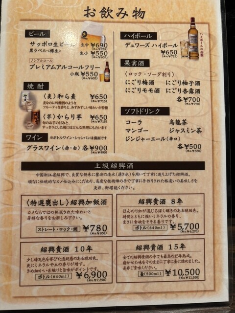 カウンターに着座して、お通し(掛霜腰果/カシューナッツ砂糖絡め)@350円をセットして頂き、ドリンクをオーダー、待っている間にメニュー確認。注文は①前菜6種盛合せ(平目のお刺身サラダ、蒸し鶏の葱生姜ソース、よだれ鶏、くらげの冷製マスタード風味、ピータン、ザーサイ)@3,400円②黒酢酢豚@1,500円、③青椒肉絲@1,600円、④善道式黒炒飯@1,400円、⑤酸辣湯@580円 ※税別表示