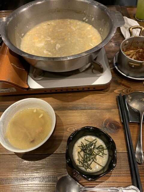 ひさしぶりに横浜での食事、友人に誘われひさしぶりに訪問。かなり前に何度か来ただけだったのでメニューが薬膳鍋メインに。いっぱい料理もかなり素材や手の込んだ料理です。はじめにマカロニサラダ、オリジナルなる感じで美味しい。次に里芋の素揚げ、こちらも素材に揚げ加減が最高!そしてメインの薬膳鍋はなんといってもお出汁がたっぷりのエキスをまとってとても濃密。一緒に入ってる麻辣の辛味のスープもピリ辛で少し足して食べるとさらに美味しい、鍋にはニンニク、松の実、なつめなど様々な薬膳がたっぷり入って凝縮されて美容、健康にとても良さそう!以前までは薬っぽいのかと敬遠してましたが概念が変わりました!そして〆にはらーめん、五島うどん、白米、3種で〆ました!追うごとに旨味が増して行く〆の3品でした!とても美味しかったです!ご馳走様でした