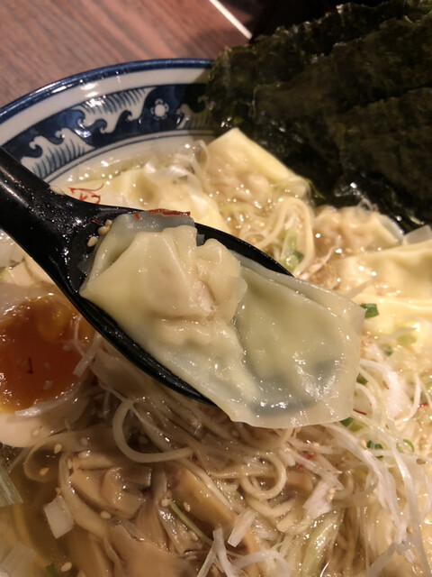 ワンタンのほか、穂先メンマ、半分煮卵、板海苔、刻みネギ。