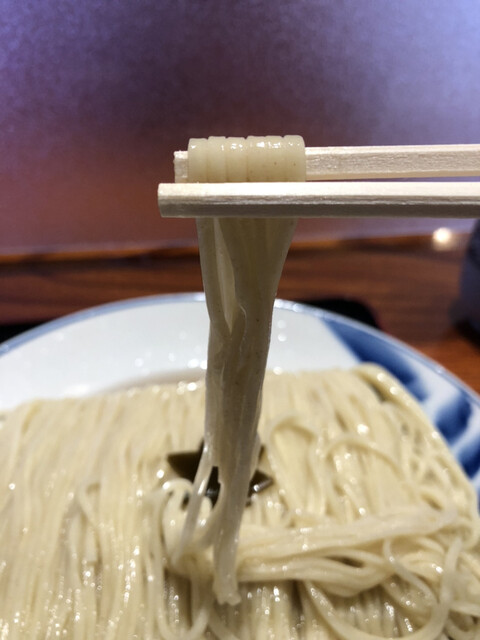透明感があり、艶やかでコシのある、全粒粉入りの麺。