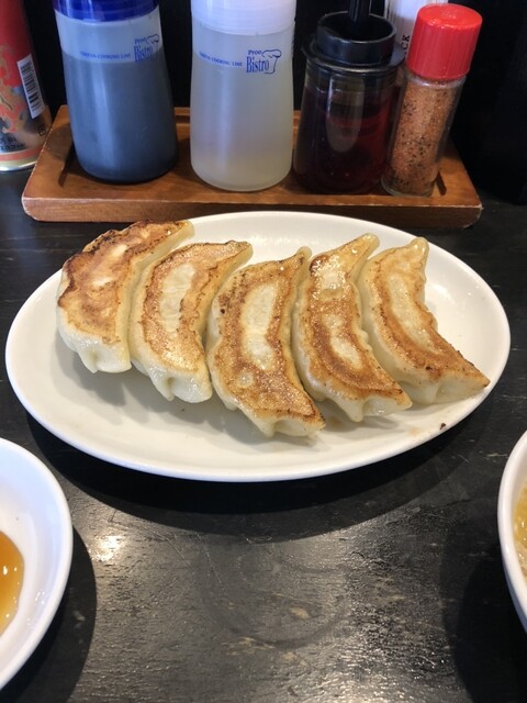 焼餃子は大ぶりで、皮はモチモチ、餡は、下味しっかりニンニクしっかり。