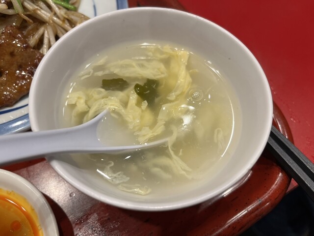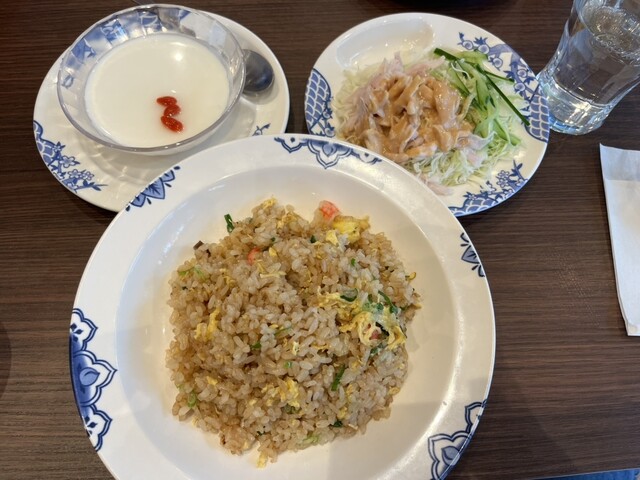チャーハン(スープ付)と蒸し鶏胡麻ソースと杏仁豆腐1043円を頼みました。