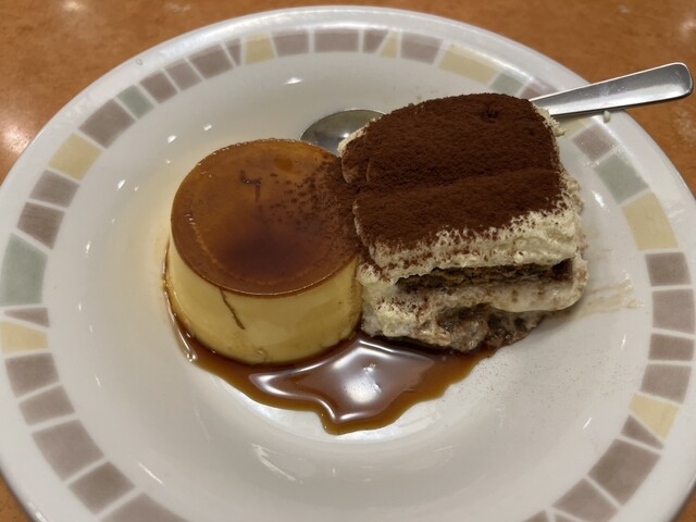 私は、プリンとティラミスの盛り合わせにしました。友人はチョコケーキとミルクジェラートを食べてました。