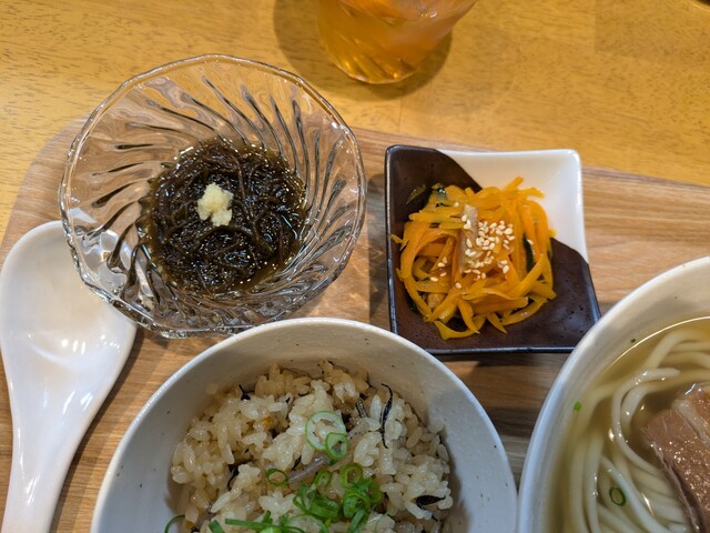 土曜日の昼前に訪問、賑わっていました。前から行きたかったものの昼間しかやっていないのでなかなか行けずでしたがようやく訪問できました。沖縄そばセット(1,200円)を注文。沖縄そばは鰹だしが効いていてあっさりしつつもガツンとした美味しいお味、じゅーしーも味が染みていて美味でした。またお冷やの代わりにさんぴん茶が頂けるのも沖縄好きにとっては良いです。
