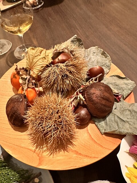 アミューズから菊の花つかった華やかなものから始まって、全体的にお皿は彩りキレイで写真映えするもの多いです。味わいも良くて野菜も多様しているので食べていても疲れないフレンチ。