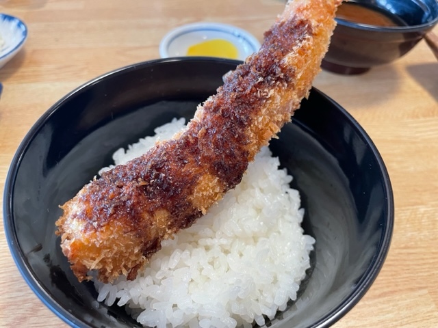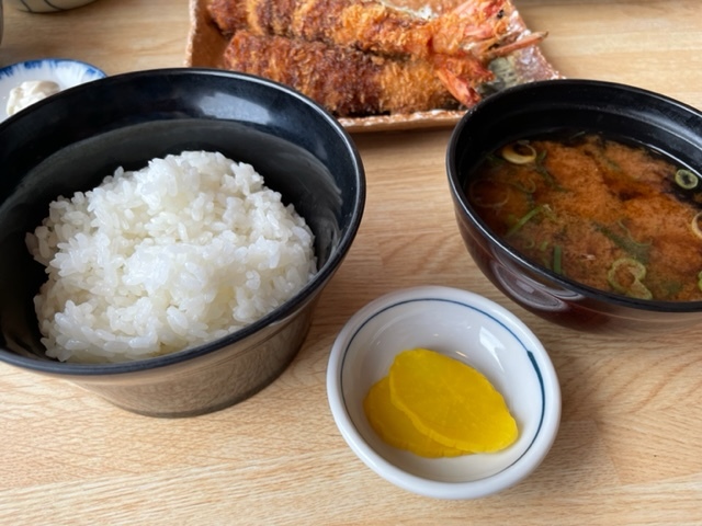 大きな海老フライ2尾は迫力があり目の前で湯気を上げる。