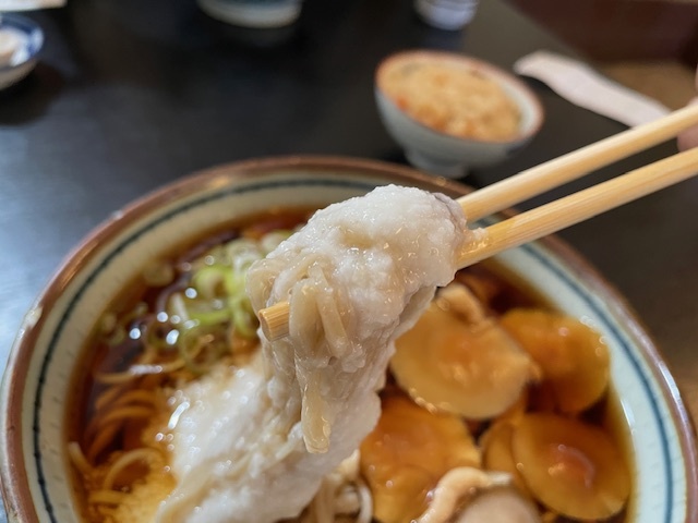 山菜・きのこおろし蕎麦が来たら、そばつゆを上から回しがける。