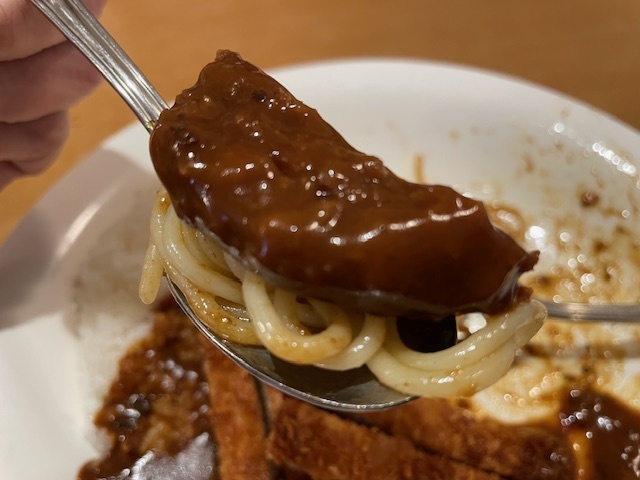 スパをフォークでクルクルしてカレーソースに付け一口。