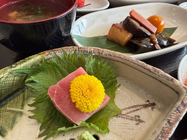 刺身はキハダマグロ、アジフライ、鉢肴は鰆西京、煮物は筍土佐煮だ。