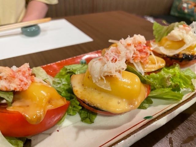 フルーツトマトとモッツァレラチーズの一口かに身サラダはサラダと言いつつもボリュームがある。