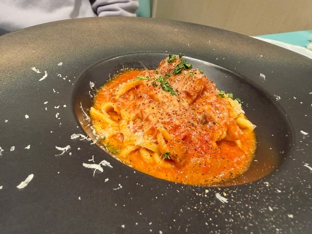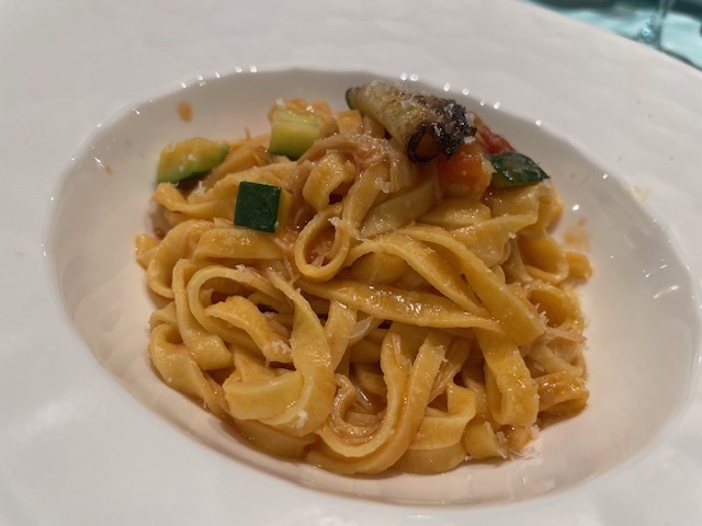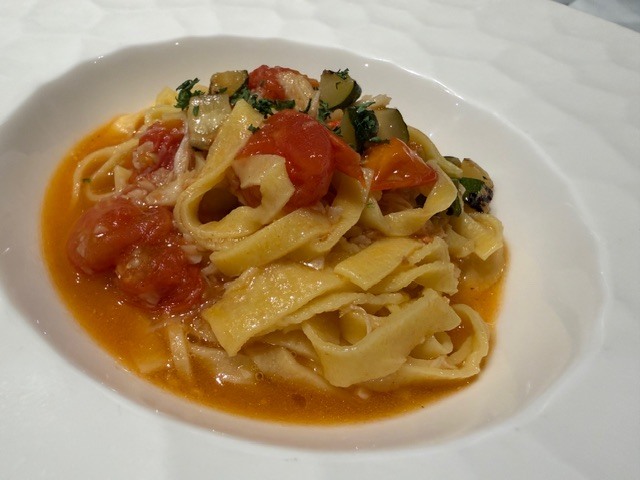 パスタはズワイガニとズッキーニのフレッシュトマト タリオリーニ。