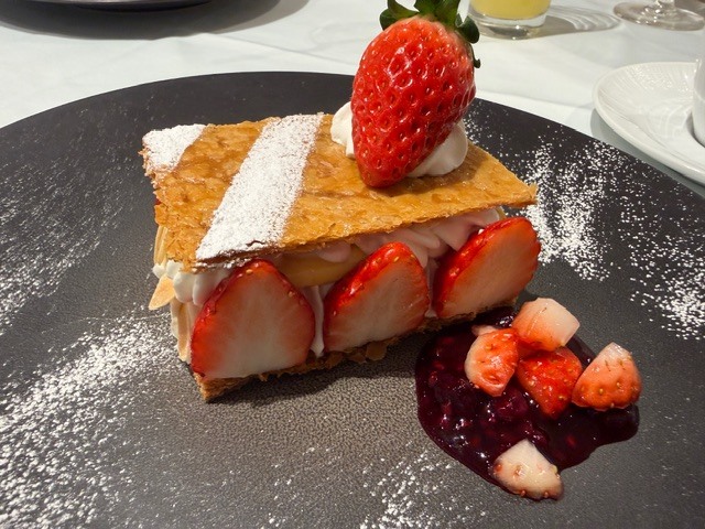 ドルチェは焼きたてパイと苺のミルフィーユだ。
