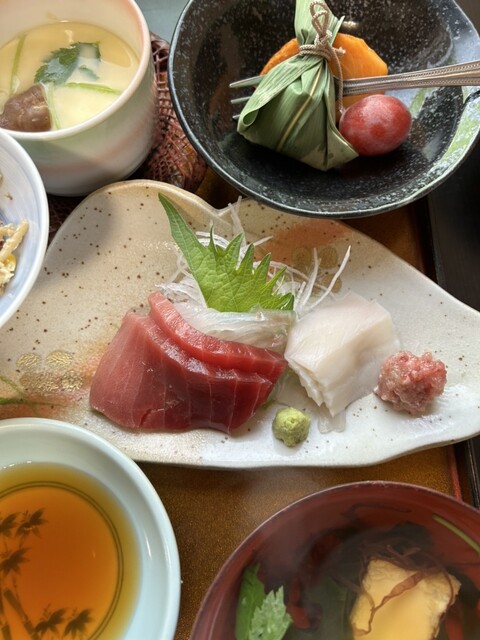 釜飯は、カニやホタテ、アサリなどが入って茶碗に三杯くらい入ります。とても美味しいです。刺身は中トロ、白身、イカ、赤身と新鮮ですね。お吸い物は薄めの味付けですが具が色々入ってます。それと茶碗蒸し、牛蒡入り、デザートまで付いてお腹がいっぱいになり大満足でした♪