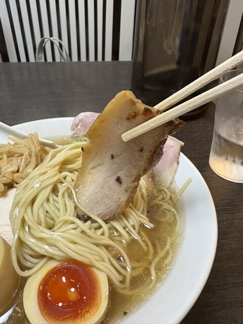 先ずはスープを頂きます。透き通った鶏がらスープで、塩辛く無い優しい醤油ですが、コクもあり美味しいです。