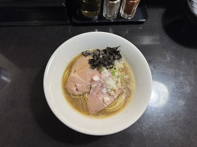 レアチャーシューとバラ海苔、ネギも相まって素晴らしい煮干そば。