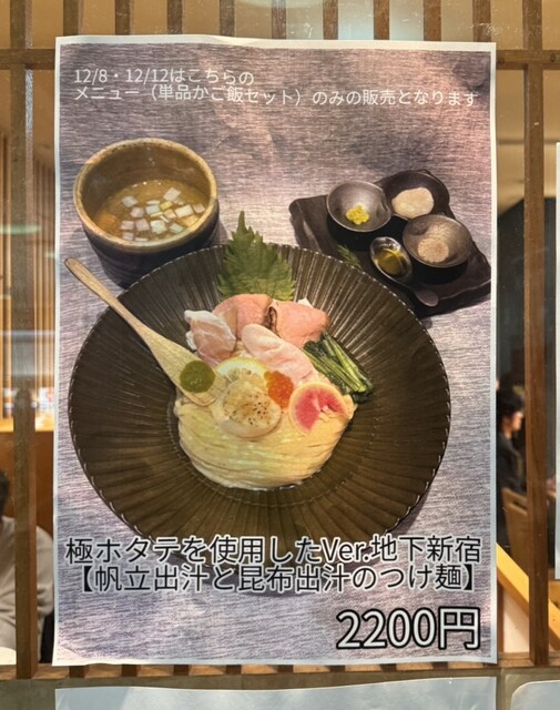 初日の12/8(月)は「極ホタテを使用したVer.地下新宿【帆立出汁と昆布出汁のつけ麺】」(2200円)と「本日の女将の気まぐれごはん^_^」は【サーモン・アボカド・まぐろのたたき 卵黄のせ」(600円)。そしてトッピングで【ワンタン(2個)】(300円)。