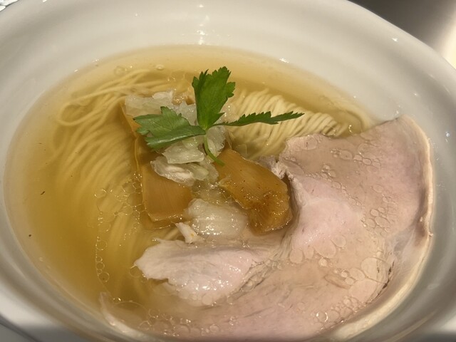 まずは「塩そば」到着。キレイなスープに玉ねぎ(刻みというより「クラッシュ」という印象)、メンマとチャーシュー、そして三つ葉。
