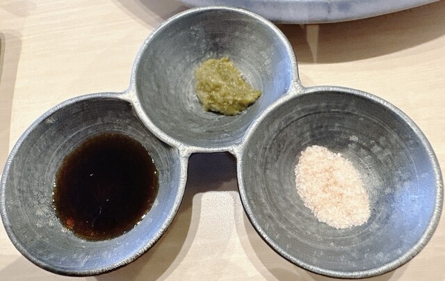 「醤油」「塩」「味噌」の3種類のつけだれに、トッピング(?)に「すだち」「わさび」「柚子胡椒」が付いており、好みの組み合わせで食べることができる。