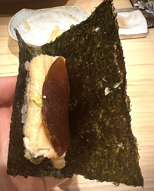濃厚な肝ソースの旨みと鮑の食感が素晴らしく、シャリと一緒にいただくとより一層楽しめます。