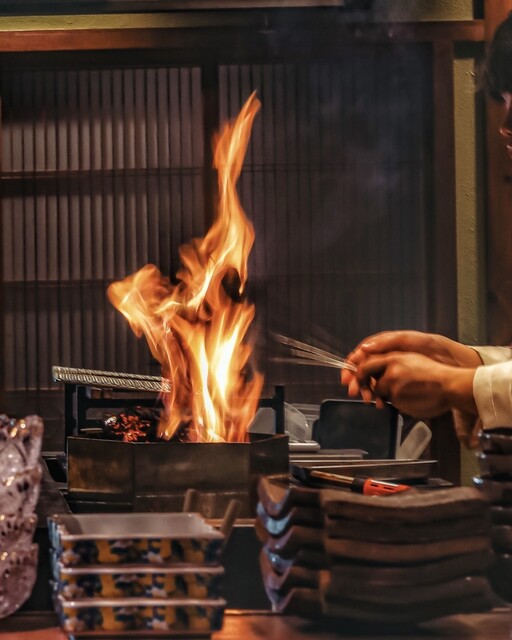 大迫力の豪快な炙りシーンは必見です◎カウンター席は臨場感を楽しめること間違いなし。