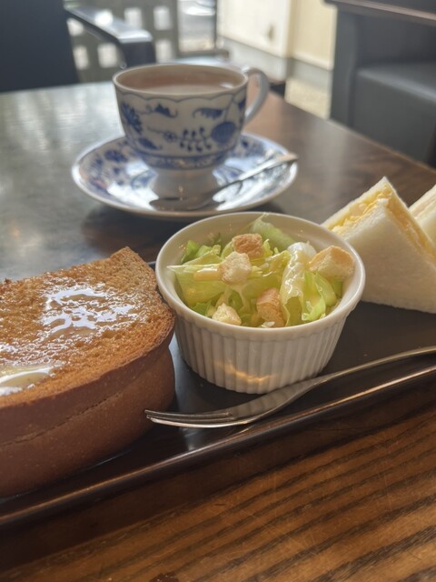 黒糖パンとサンドウィッチ、サラダもついてきます。サンドウィッチもたまごとハムで違うものが出てくるのも細かいところが嬉しい。