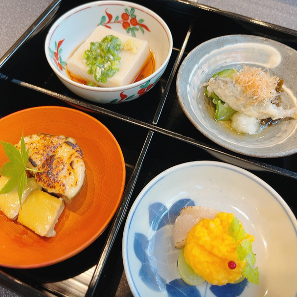 <季節の料理を盛り込んだ松花堂、名物の瓔珞豆腐、鯛ごはん又は鯛茶漬けを一度にお楽しみいただける一番人気の内容です。山海の珍味の八寸やロングセラー商品の鯛カマのアラ炊き、デザートもついた充実のお料理です。>