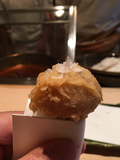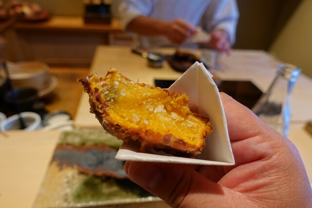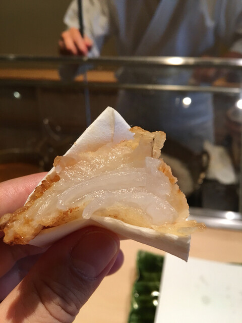 ⚫︎玉ねぎ・・・ヤングコーンは高温でサクッと玉ねぎは低温でじっくり!しかも直ぐ出すのではなく若干寝かしてからです。これが天ぷらが蒸し料理と言われる所以でしょう!志村さんは甘味が頂点に達する頃合いを見計らって手渡ししてくれます。水分比率、甘味、柔らかな食感!全てが完璧と言っていいでしょう!