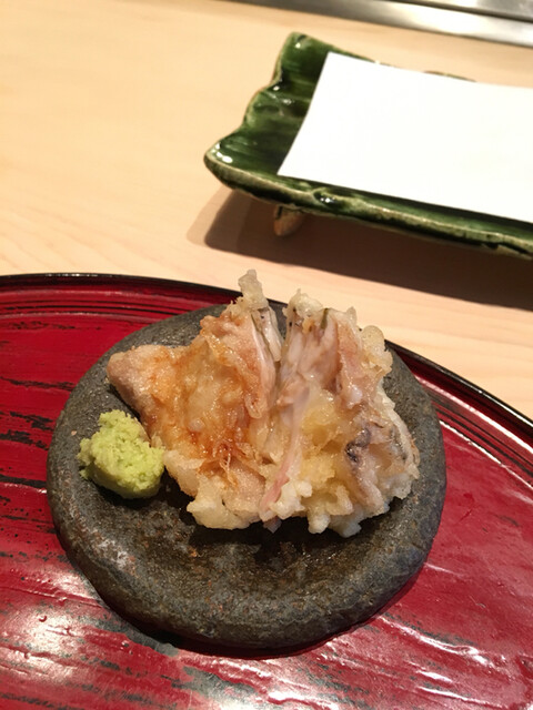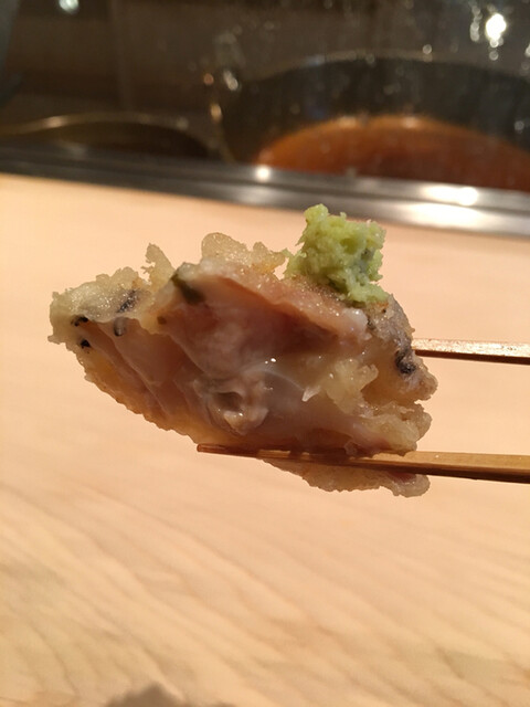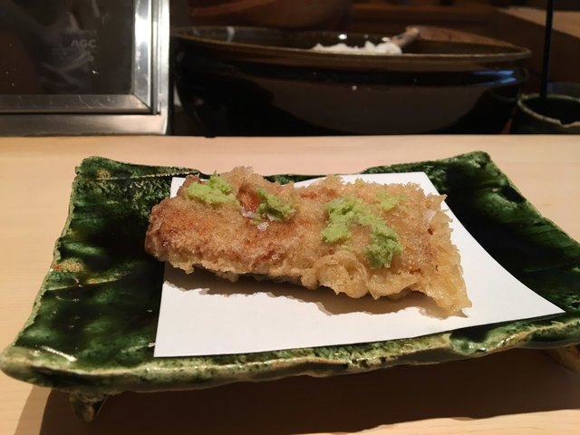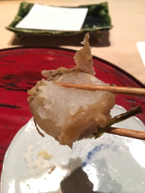 ★クエ・・・御前崎の26㎏!目の前で丁寧に切りつけ脂の強い腹の部分は炙って供されます。煮切りが軽く振られ肉厚のクエを山葵たっぷりとマルドンで!これは天ぷら屋のレベルに非ず(^.^)成生さんのレベルの高さが伺える逸品です。