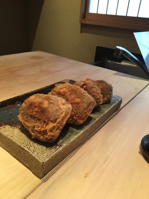 ★黒アワビ肝ソース和え・・・お次はふわっと張りが出て最高の食感に仕上った天ぷらで!衣の中に広がる品のある旨味に清廉な苦味の肝ソースが寄り添い完璧な一皿に!一切味付けはせずそのままで(๑˃̵ᴗ˂̵)自然の滋味に感謝!
