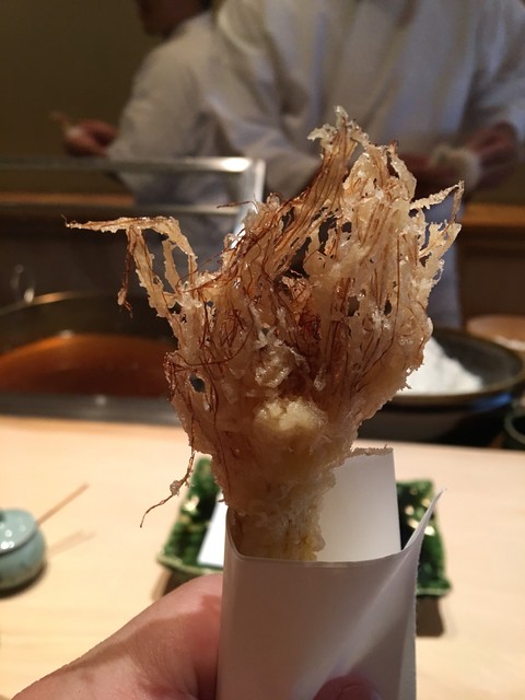 ⚫︎穴子・・・伊勢若松産の小ぶりの穴子は活きがよく志村さんの手をスルッと抜け出しそうです。目打ちし鮮やかに捌いた穴子を手際よく揚げていきます!口に含めばサクッと衣が解け穴子の旨味が弾けます。旨いね~~