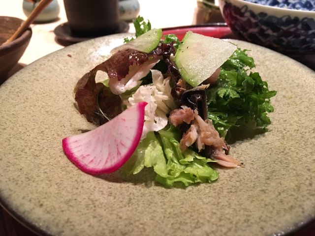 三河の子持ちシャコのサラダ・・・あっさりした酸味のドレッシングで一休み!お次の黒アワビのお刺身へさらりと繋ぐ素晴らしい流れあっさりした酸味のドレッシングがいい~