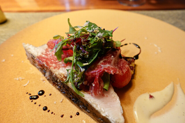 2.3時間程蒸し焼きにしてから燻製にして炭で炙った三浦のサワラ・・・藁で叩いているのでスモーキーな香りが鼻腔をくすぐります!神戸牛のブレザオラの塩味、トマトとナスの酸味と甘みにハーブの苦味がしなやかなサワラの旨味を包み込みます!バルサミコ、タプナード、シーザーの酸味の共演も素晴らしい~