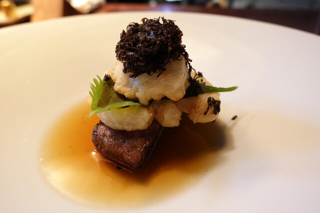 3.石垣牛のリブ芯とフグの白子・・・低温でじっくりと火入れ後炭火で仕上げたリブロースとさっと湯掻いて白出汁に漬け込んでベニエにした白子をカツオ出汁とポン酢のソースに絡めて一緒に!リブロース、白子、大葉、姫路のレンコン、トリュフの5重奏!イメージは白子ポン酢!最後に大根おろしを合わせて更にさっぱりと和テイストに~