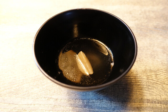 4.真鯛のお出汁・・・愛媛県の神経〆にした真鯛を昆布〆にして出汁を取ったお碗!真鯛の身と水と塩のみの非常にシンプルな旨味に身体がリセットされます。中にはゆっくり炊いてしっかり味を入れた蕪が横たわり、全てメインで押してくるコース構成の中にあって暫しの静寂が訪れます。美味しいです!
