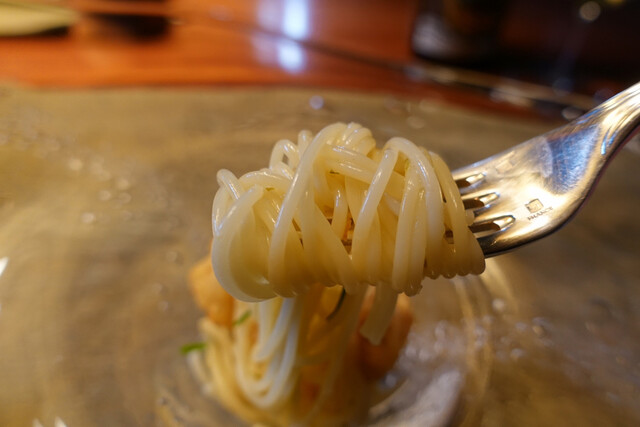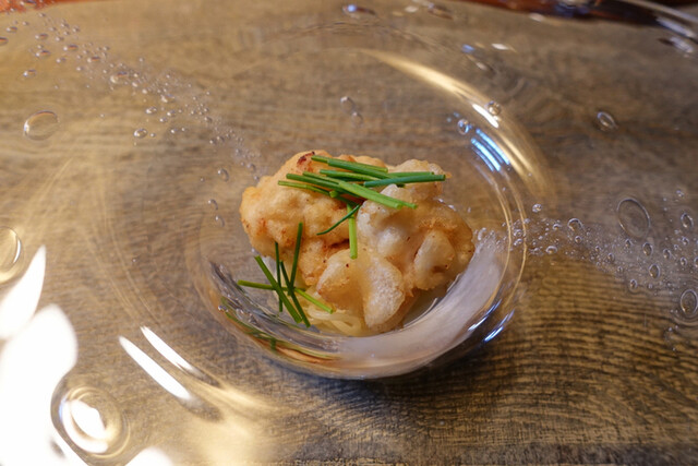 6.スペシャリテの白子パスタ・・・根室の白子を白出汁に浸して天ぷらに!ハマグリのお出汁と柚子胡椒を絡めた冷製パスタに低温調理で旨味パンパンの白子がまったりと溶け込みます。温度のコントラストも味わい深い!