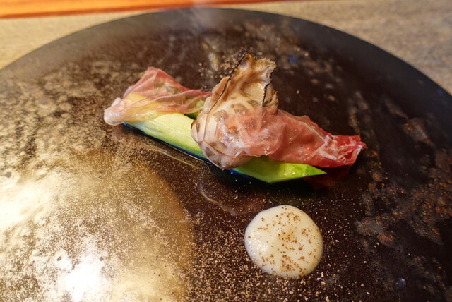 7.牡蠣&アスパラ・・・酒蒸し後薫香を纏わせた厚岸の牡蠣は歯を当てると磯の滋味がじわっと弾けだしスチームで保湿して素揚げにした白神山地のアスパラの柔らかさに溶け込みます。24ヶ月熟成のネロパルマ生ハムの塩気にホワイトアスパラのピュレの酸味も印象的