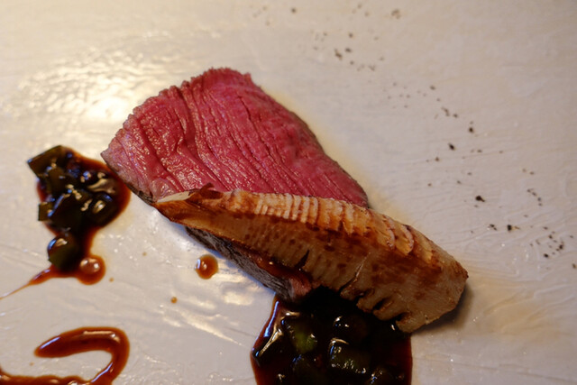 ☆対馬のノドグロのベニエ・・・合わせるのは愛知県産椎茸(平山農園)の炭火焼に神戸牛のブレザオラ(川岸牧場)です。ベルーガの塩味がベニエにピタリと寄り添い、肉厚な椎茸と一緒に頬張るとその濃厚な香りが脂が落ちてふわっと優しい味わいのノドグロを包み込みます。そこにブレザオラの趣の異なる塩味が追いかけてくるのですからもう堪りません。