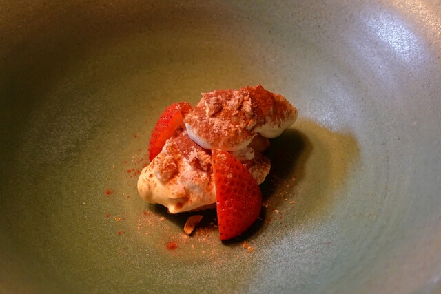 ⚫︎いちご大福をイメージした一皿・・・一番下にはもち米を使ったディオレ(お米を牛乳で炊いたもの)が敷かれ、こしあんとつぶあんを別々に炊いて後で合わせた北海道の小豆の上には少し酸味のあるフロマージュブランのシャーベット!トップには三種類の品種を掛け合わせた酸味と甘みのバランスが素晴らしい北海道のよつぼしにレモンのジュレ!小豆の上品な甘味さにいちごの酸味と甘味が合わさり非常にフレッシュないちご大福に仕上がってます(^_-)