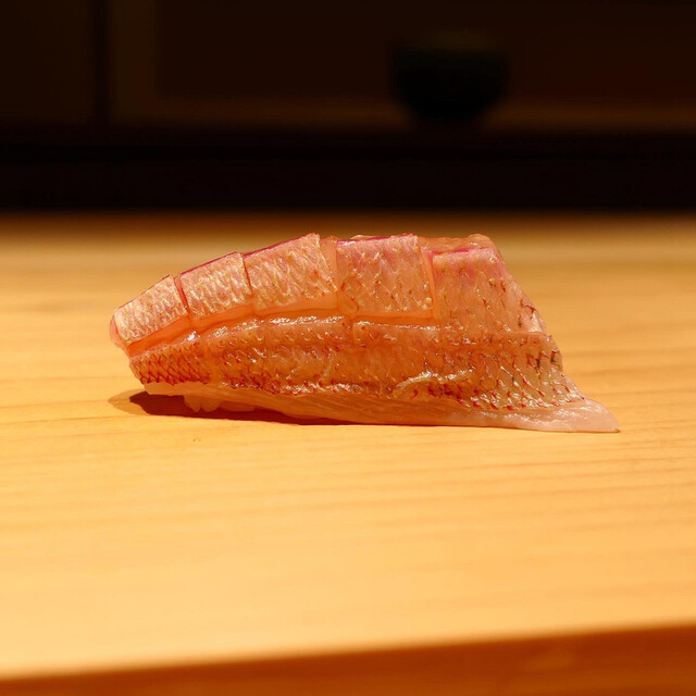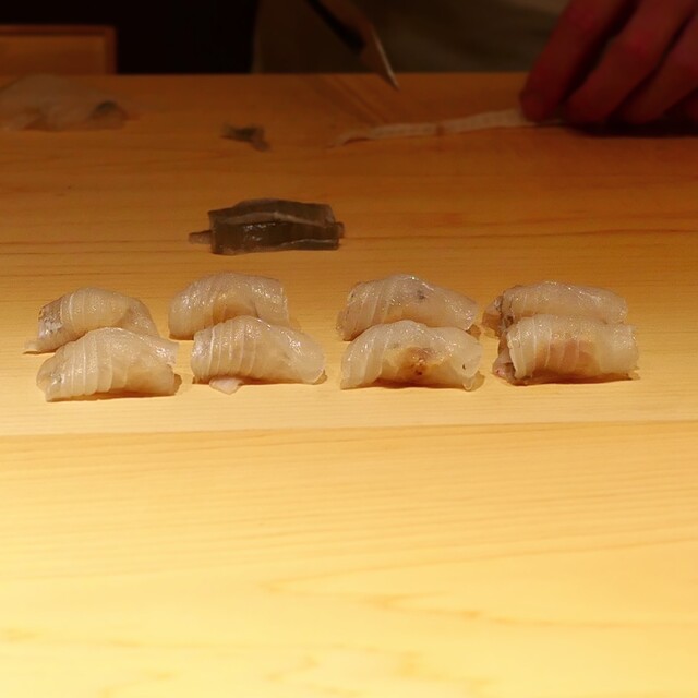 1.春子鯛・・・分厚い切り付けの春子鯛は余韻が凄いですね〜柔らかな酢飯は穏やかな酸味を香らせ美しいバターのような脂の旨味に寸分の狂いもなく重なります。この握りのテーマは〝一体感〟必ず最初に出す一貫とのこと!酢飯の粘りと春子鯛の柔らかさがピタリと重なる時間を逆算してシャリを切り春子鯛を仕込みます。握りに対する確固とした哲学を語る工藤大将は凛とした佇まいでカッコいい(๑˃̵ᴗ˂̵)