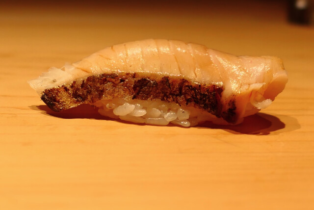 3.キンメ炙り・・・焼きの香りが素晴らしく脂がこの上もなく甘い!人肌の酢飯の温もりと燗酒のマリアージュで極上脂を溶かして楽しみます。美味しい。