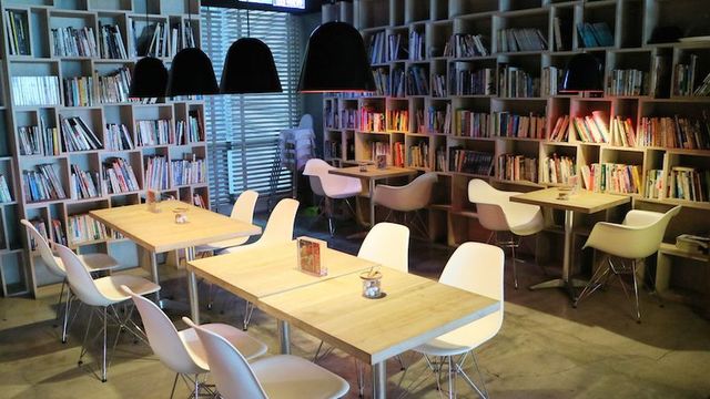 1階のカウンター席に加え、広々とした2階にはたくさんの客席があります。このフロアの主役と言えるのが天井まで続く大きな本棚。そこには雑誌から書籍まで色々な本があります。