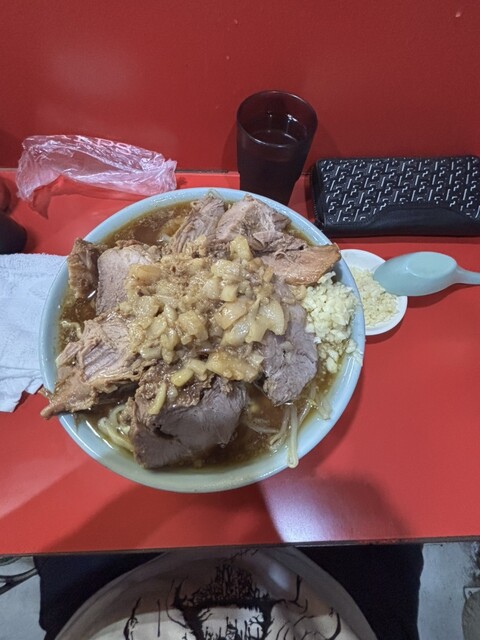 豚ラーメン(ニンニク多め、ちょいアブラ)、ゆでたまご、ブタカスアブラ