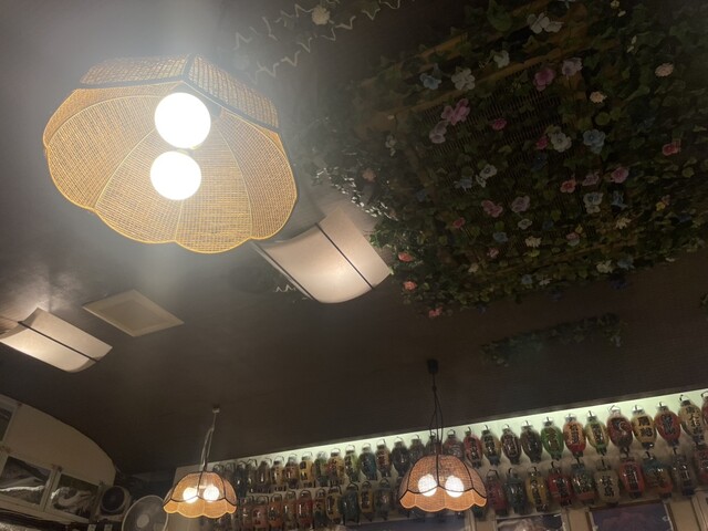 昭和の歌謡曲?が大音量で流れ、壁も天井も造化や写真、提灯などいろいろな物がたくさん飾られていました!