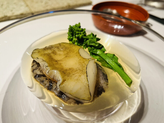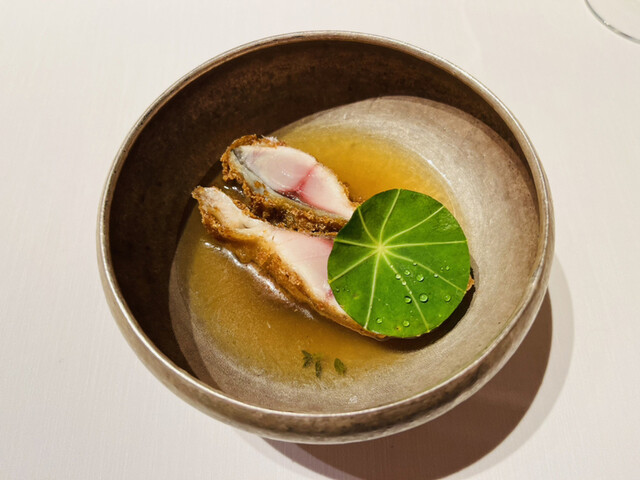 地鶏の骨や車海老等で取った泡ソースで頂きます。