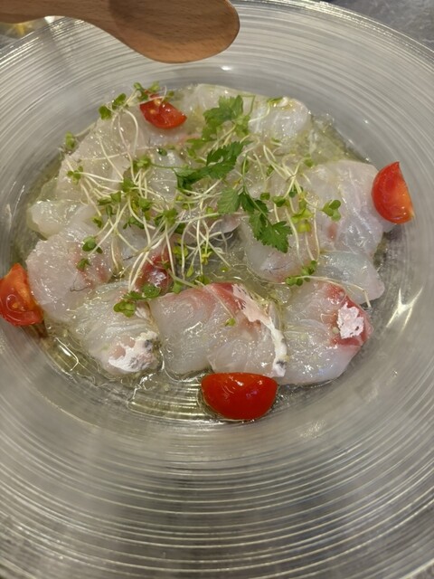 鮮魚のカルパッチョは新鮮でほんのり甘くさっぱりです。有機野菜のバーニャカウダは見た目にも楽しくディップの味も好みでボリュームあり。アンティパスト5種盛りは生ハムとサラダが特に美味しかった。スペシャルお肉の盛り合わせは4種のお肉を楽しめます。ボリュームもあり、お肉も柔らかくてどれも美味しかった。シュリンプのフリットも衣がからっとしていてかなりの大きさでとにかく美味しい。これも絶対食べるべきです。期待のパスタはポルチーニ茸のクリームソースと、ゴロゴロベーコンのアマトリチャーナ。両方とも絶対頼んだ方がいいです。しっかりめのソースがよく絡んでいて最高でした。他のパスタもぜんぶ食べてみたいと思いました。デザートはティラミスとバスクチーズケーキ。甘さ控えめでカフェ利用もできると思います。スタッフの接客もとても感じがよくてパキパキと気配りをしてくださって気分が良かったです。テラス席もあったので次はワンチャンと一緒に来ようと思います。コスパがよくて大満足です。久しぶりにいいお店をみつけました。ご馳走様でした。