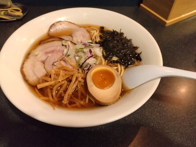 10分程して着丼、チャーシュー2枚、煮玉子ハーフ、ばら海苔、葱ミックス(紫玉ねぎと長ねぎ)、細目のメンマがトッピングされてます。スープはきれいに透きとおったスッキリ淡麗ですが、シッカリと煮干しの香りと味わいを感じます。かなり完成度が高いスープです。